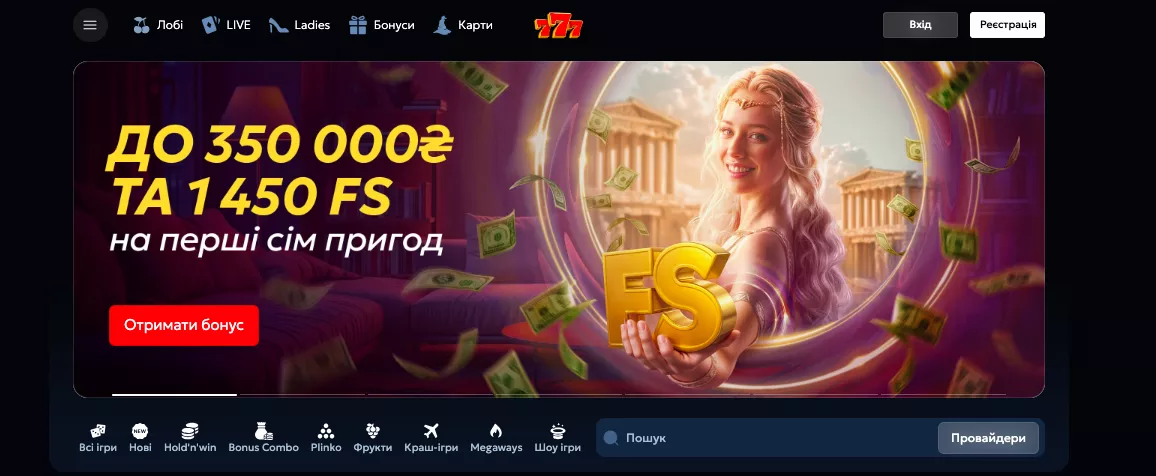 777 — це популярний онлайн-ігровий клуб, який був запущений у 2023 році та орієнтований на гравців з України. Казино працює за ліцензією КРАІЛ, що гарантує легальність та безпеку азартних ігор на платформі. На сайті представлено понад 6000 ігрових автоматів від більш ніж 70 провайдерів, включаючи слоти, рулетку, покер та інші популярні ігри. Казино пропонує вигідні бонуси для новачків, зручні методи поповнення рахунку та швидке виведення коштів.