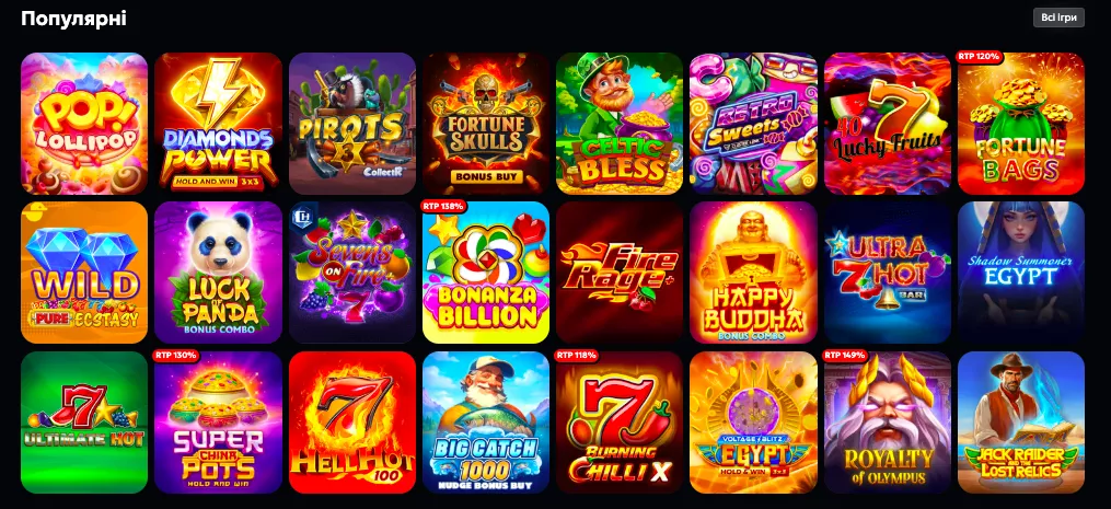 | Провайдери ігор | NetGame, Playson, Pateplay, 3 Oaks Gaming, Spinomenal, Champion, Amigo Gaming, Push Gaming, Amatic Industries, Popiplay, Endorphina, Nolimit City, Platipus, Red Tiger, Thunderkick, Pragmatic Play, Ezugi, Revolver Gaming, Booming Games, Blueprint Gaming, Quickspin, NetEnt, 1×2 Gaming, Crazy Tooth Studio, SpinPlay Games, Gameburger Studios, Alchemy Gaming, Betsoft, Big Time Gaming, Evolution, Habanero, All41 Studios, BullShark Gaming, Oryx Gaming, Kalamba Games, Ruby Play, Games Global, Wazdan, Iron Dog Studio, Just For The Win, Triple Edge Studios, Backseat Gaming, Aurum Signature Studios, Pear Fiction, Switch Studios, Foxium, Avatar UX, Slotmill, Hacksaw Gaming, Fortune Factory Studios, Pulse 8 Studios, Snowborn Games, Spribe, Novomatic, SmartSoft Gaming, Pocket Games Soft (PG Soft), Slingshot Studios, Northern Lights Gaming, Amusnet Interactive, EIG Gaming, Red Rake Gaming, TVBET, Live 88, Retro Gaming, GameArt, OneTouch, Gaming Corps, HO Gaming, Onlyplay, Barbara Bang, Macaw Gaming, DLV, BGaming, Concept Gaming, High Limit Studio, Infinity Dragon Studios, Ino Games, Nailed It Games, Neko Games, Neon Valley Studios, Wishbone, Blue Ring Studios, Nanshe Gaming. |